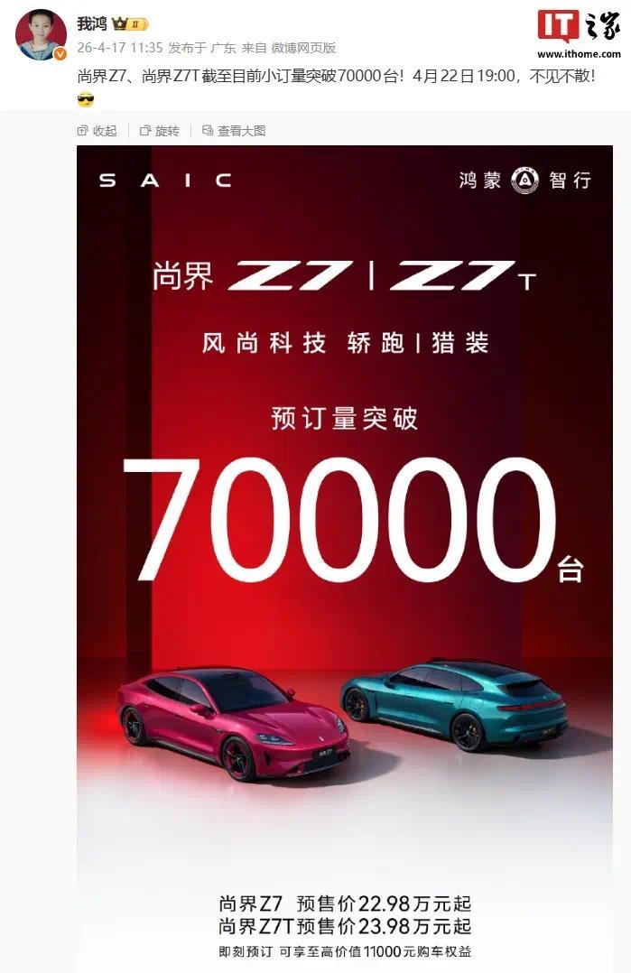 IT之家 4 月 19 日消息,据博主 @我鸿 分享,鸿蒙智行“风尚科技”轿跑 / 猎装新车 —— 尚界 Z7 / Z7T 新车预订量突破 7 万台,预售价 22.98 万元 / 23.98 万元起。